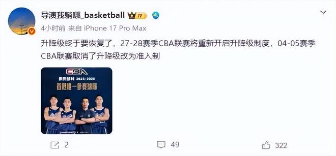 在这次俱乐部高层会议上,还确定了升降级方面的事宜。在去年的休赛期里,就有媒体放出口风,表示CBA联赛在考虑扩军或者恢复升降级。这不仅引发了球迷热议,还使得本赛季的NBL球队数量增加了不少,不少球队都想要杀入CBA。就在这次俱乐部高层会议上,CBA官方终于确定了相关政策。据媒体人“导演我躺哪儿”透露,CBA联赛会在27-28赛季正式恢复升降级。